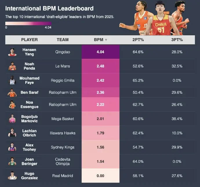 从榜单中能看出,杨瀚森BPM值高达4.04,断档领先所有今年参选的国际新秀。(BPM值可以作为评估身处不同联赛的国际新秀每百回合攻防两端对球队的贡献,以及在联赛的统治力)