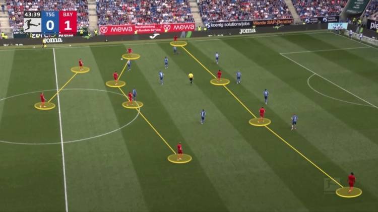在上个月德甲收官战,4比0战胜霍芬海姆的早期阶段,拜仁积极进取,试图通过早早进球让比赛失去悬念。如上图所示,在组织进攻时,孔帕尼的球员们大胆采用了2-4-4阵型,主要将中场球员保持在球场中央三区及肋部区域,而宽度则由紧贴边路的两名边锋提供。这创造了多种多样的传球线路来为凯恩等人输送炮弹,同时几乎总有一名队友准备好随时接应,以防丢失球权。