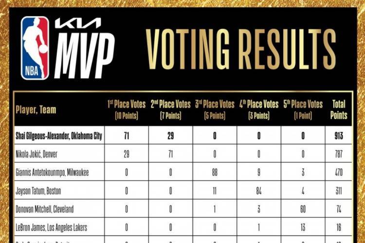 5月22日,NBA官方宣布,雷霆球星亚历山大荣获本赛季MVP,投票详情如下: